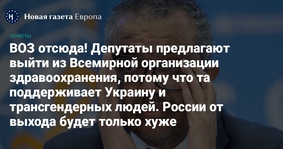 В России же вообще поднялась дискуссия о возможности выхода из ВОЗ, ее инициатором стал депутат Госдумы от «Единой России» Пётр Толстой. Его, правда, волнуют другие вопросы: то, что ВОЗ поддерживает Украину и не считает болезнью транссексуальность.