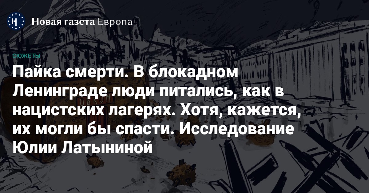 Однако в блокадном хлебе 71% составляла вода. Еще 10–15% от общего веса пайки составляла гидратцеллюлоза, и только 15–20% приходились на ржаную муку с примесями. Иначе говоря, в лучшем случае мука с примесями составляла в пайке 25 г, а в худшем — 19–20 г. 20–25 грамм — это 65–80 ккал.