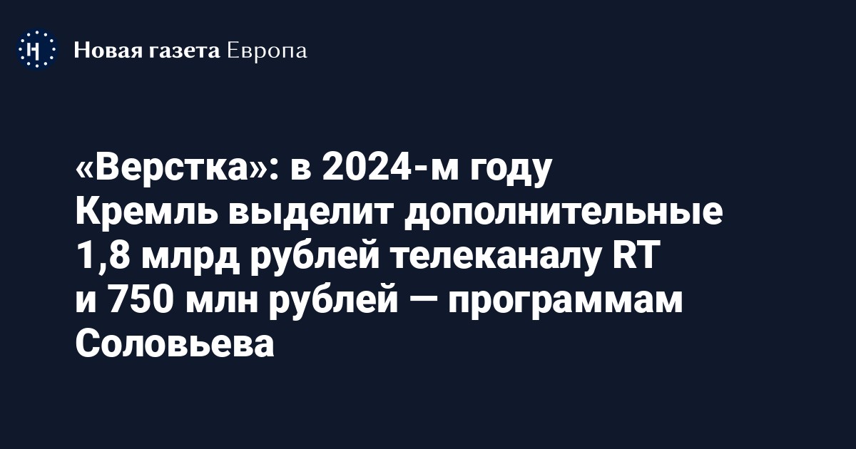 Холдинг Russia Today в 2024 году получит на 1,8 млрд рублей больше, чем было заложено в прошлом бюджете, а РТРС — на 10,1 млрд больше. Всего компания РТРС, занимающаяся оказанием услуг связи эфирного телерадиовещания, в ближайшие три года получит на 22,4 млрд рублей больше, чем планировалось в прошлом бюджете.