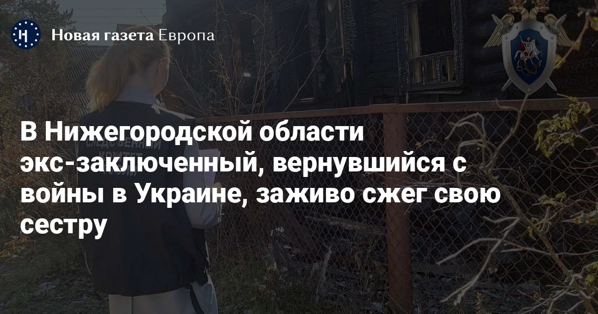 В городе Заволжье Нижегородской области 55-летний мужчина, ранее приговоренный к 11 годам колонии и отправившийся на войну в Украине, облил свою сестру бензином и сжег ее заживо. Об этом сообщает местное издание NN.ru.