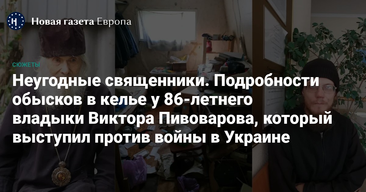 В храме 86-летнего священника Виктора Пивоварова, ранее оштрафованного за «дискредитирующую» армию проповедь, 3 октября прошли обыски. Силовики угрожали его помощнику, избивали и пытались насильно обрить, а позже арестовали на два дня за «сопротивление полиции». Самому Пивоварову угрожают уголовным делом о повторной «дискредитации» армии.