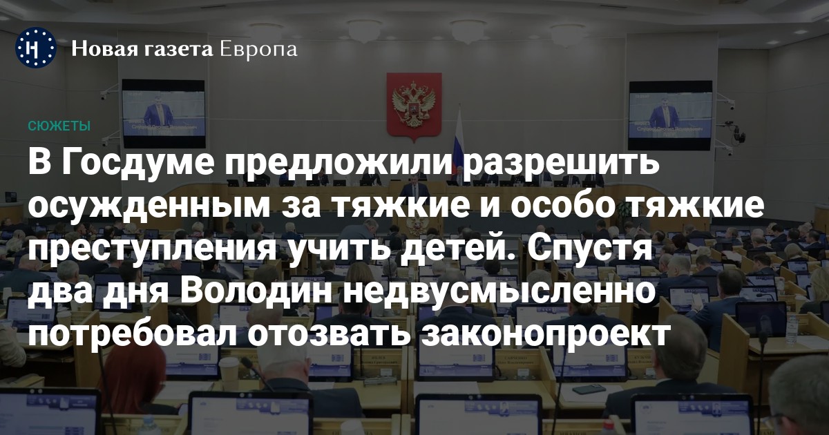 В понедельник 16 октября ряд депутатов от «Единой России» во главе с заместителем председателя Госдумы Петром Толстым внесли на рассмотрение законопроект, по которому осужденным за ряд тяжких и особо тяжких преступлений предлагается работать с детьми в качестве педагогов и тренеров.