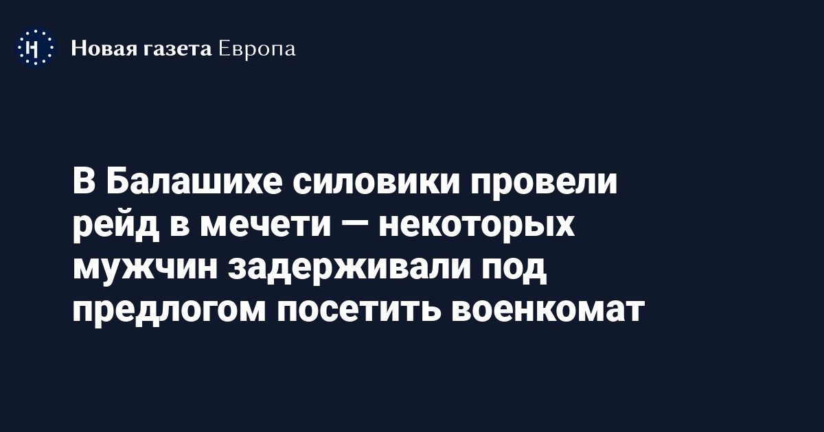 Имам мечети в Балашихе также подтвердил «Новой-Европа», что 17 ноября в молельном доме прошел полицейский рейд. По его словам, у верующих спрашивали документы, некоторым из них — «предложили служить». На вопрос о том, предлагали им пойти служить по контракту или в рамках призывной кампании, он не ответил. При этом, по его словам, к молельному дому подогнали автобус, но он не остался до конца облавы, так что не может сказать, увезли ли кого-то на нем.