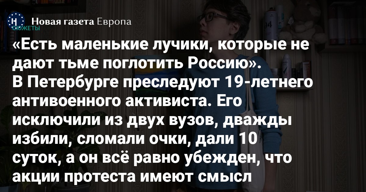 — С того момента как в России объявили частичную мобилизацию, я начал выходить на акции протеста в Петербурге, а потом просто не смог прекратить, и до сих пор не могу — всё время возникают новые поводы, — объясняет 19-летний Дмитрий Кузьмин, бывший студент, уже дважды за последние полгода отчисленный из петербургских вузов за протестную деятельность. За свое право говорить прямо, честно, открыто то, что он думает о войне в Украине, о политике российских властей и действиях городских чиновников, парень поплатился сначала возможностью учиться (главным, ради чего он переехал в Северную столицу из маленького кузбасского поселка с населением в 10 тысяч человек), а теперь — свободой.