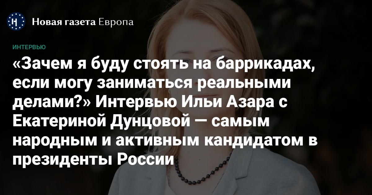 Президентские выборы в России должны состояться в марте 2024 года, а пока официально кампания не объявлена, ярче других кандидатов о себе заявила Екатерина Дунцова, журналистка и мать троих детей из города Ржева в Тверской области. Ее предвыборная программа проста: прекращение боевых действий, демократические реформы и освобождение политзаключенных. Сейчас у Дунцовой стремительно увеличивается аудитория телеграм-канала, она раздает интервью эмигрантским СМИ, про нее говорят Екатерина Шульман и Виктор Шендерович. В России журналисты и пропагандисты ее, наоборот, игнорируют. Вместо них с Дунцовой беседовали в прокуратуре, хотя, будучи депутатом Ржевской думы, Дунцова была вполне системным политиком.