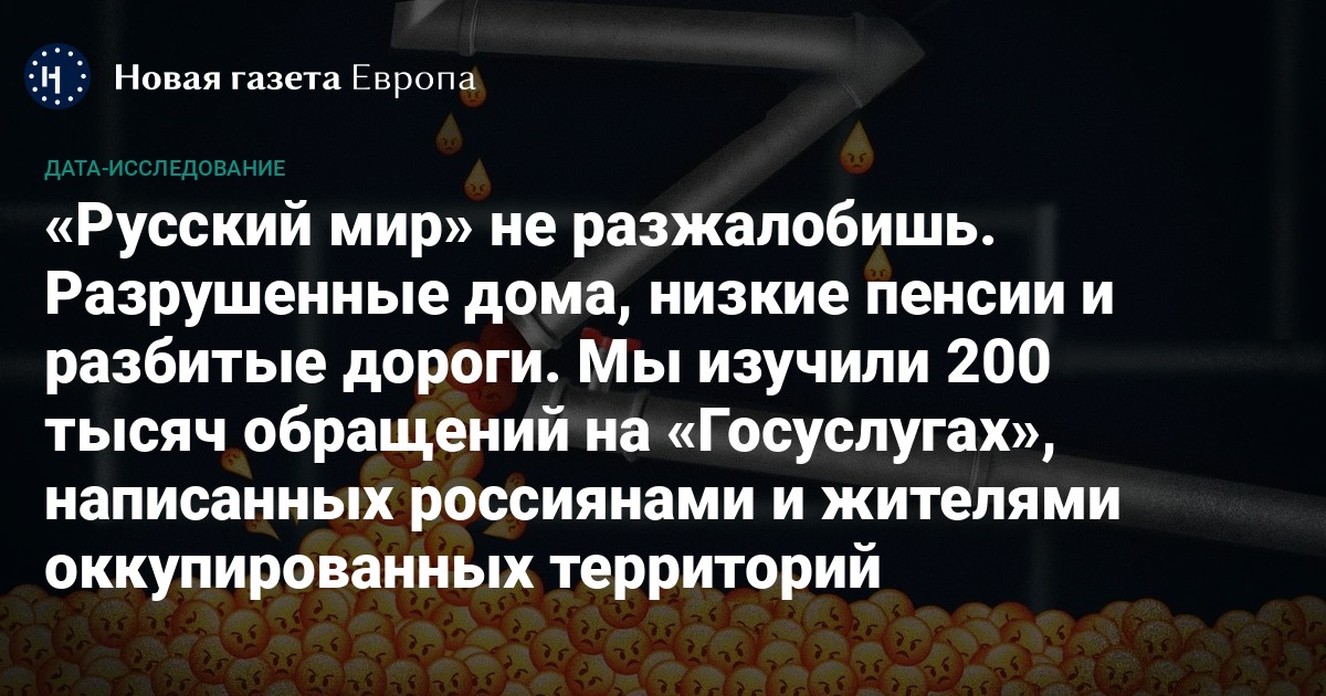 В сентябре прошлого года в России запустился единый Портал обратной связи, через который можно направить обращение в любой орган власти. Теперь на «Госуслугах» россияне жалуются на инфляцию, пишут доносы и протестуют против мобилизации, а жители оккупированных территорий просят заменить разрушенное жилье и починить трубопровод. «Новая-Европа» изучила 200 тысяч обращений с портала и получила характерный срез проблем, которые по-настоящему волнуют людей, но обычно остаются без внимания российских властей.