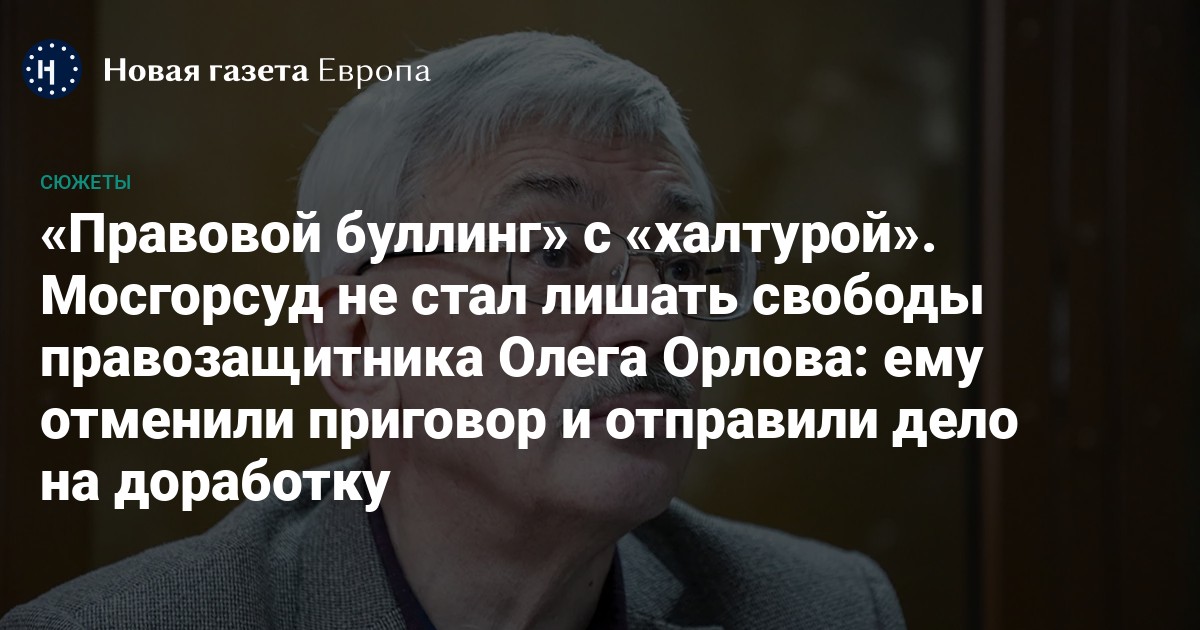 На заседании Московского городского суда неожиданно для всех прокуратура изменила требование апелляционной жалобы на приговор правозащитнику Олегу Орлову. Первоначально надзорное ведомство просило отменить ему штраф и назначить реальный срок за публичную «дискредитацию» российской армии, но уже в суде прокурор предложила вернуть дело на доследование. По мнению ведомства, в материалах не учтен мотив преступления. Защита и сам обвиняемый просили полного оправдания, поскольку в деле нет доказательств вины. Однако судья, отметив их «блестящее» выступление, всё равно пошла на поводу у прокуратуры.