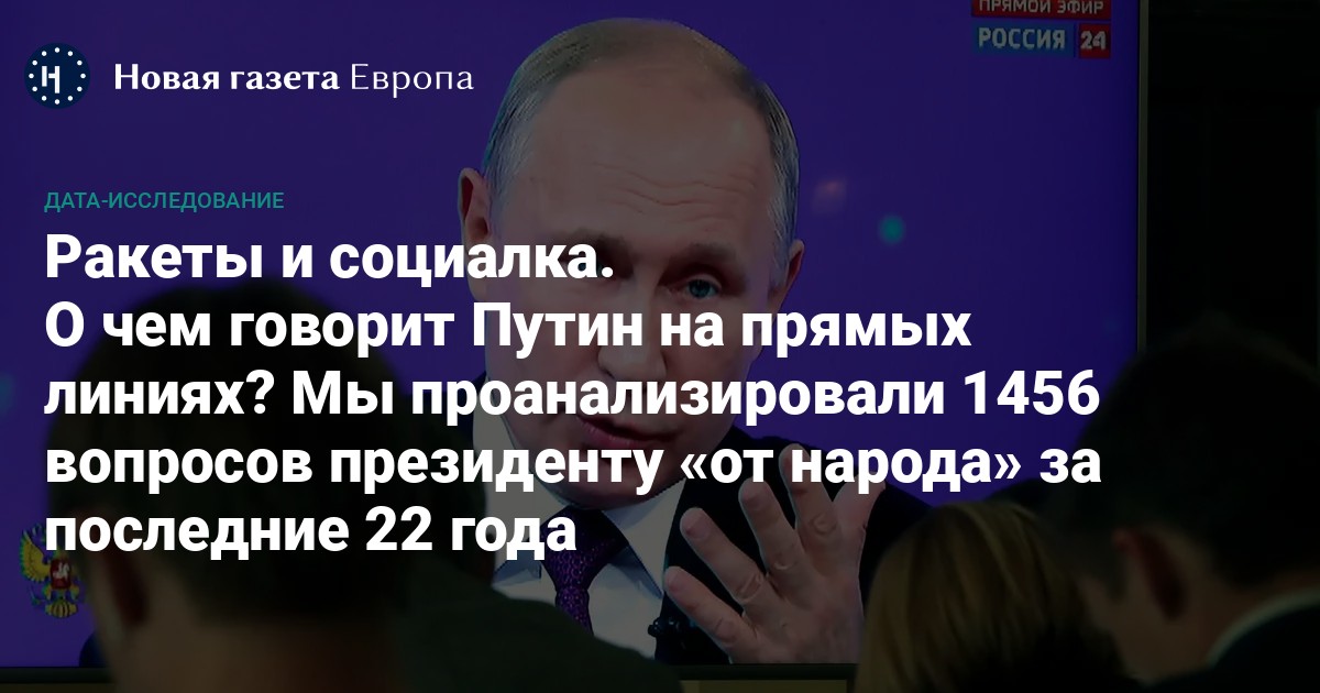 Сегодня Владимир Путин проведет прямую линию и итоговую пресс-конференцию для СМИ. Это первый после начала полномасштабного вторжения в Украину разговор президента с населением в прямом эфире и важная часть подготовки к выборам 2024 года. С начала нулевых такие мероприятия с участием Путина проходили уже 19 раз, за это время ему задали 1456 вопросов, рассчитала «Новая-Европа». На графиках показываем, как и о чем президент общается с народом.