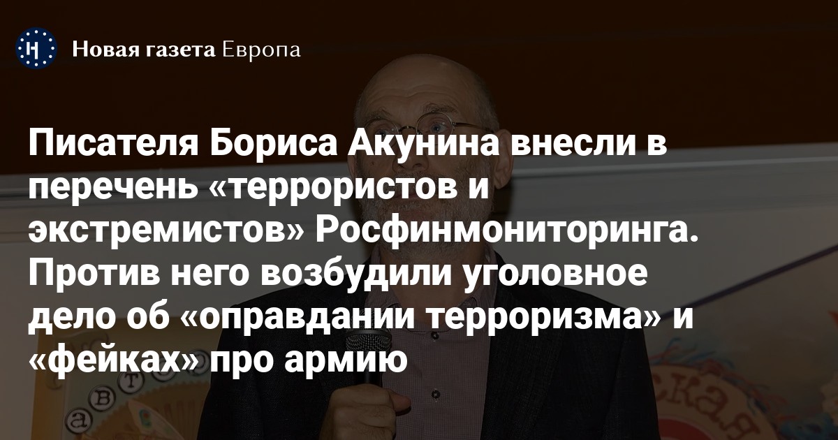 18:18 (мск) — Акунина подозревают по статьям об «оправдании терроризма» и «фейках» об армии (ст. 205.2, ст. 207.3 УК РФ), сообщили в СК. Уголовное дело против писателя возбудило Главное следственное управление СК России. Акунина планируют объявить в розыск.