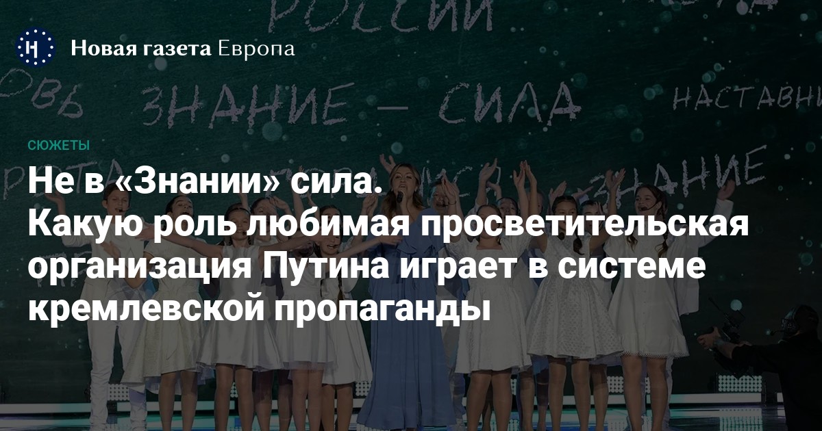 Сам Владимир Путин, вероятно, «Знание» так и воспринимает: скорее как «детскую площадку», куда периодически можно спускаться для проведения двухчасовых открытых уроков и общения с «правильной» молодежью. Учитывая регулярное упоминание «просветительской миссии» советской эпохи, можно предположить, что «Знание» для Путина — предмет персонального интереса, как своеобразный коллекционный «консерв» из СССР вроде нового пионерского движения, перезапуск которого для президента тоже, очевидно, является чем-то личным, достойным споров о его названии с вице-премьерами.