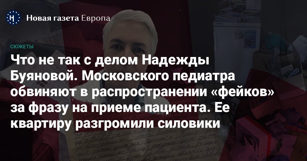 В Москве 67-летнего педиатра Надежду Буянову обвиняют в распространении «фейков» про российскую армию (ч. 1 ст. 207.3 УК) из-за разговора с пациенткой. По версии следствия, врач на приеме назвала погибшего на фронте бойца «законной целью Украины». После этого к педиатру домой пришли силовики и во время обыска разгромили квартиру. Буянова не признает вину, защита настаивает на прекращении уголовного дела. Суд избрал ей запрет определенных действий.