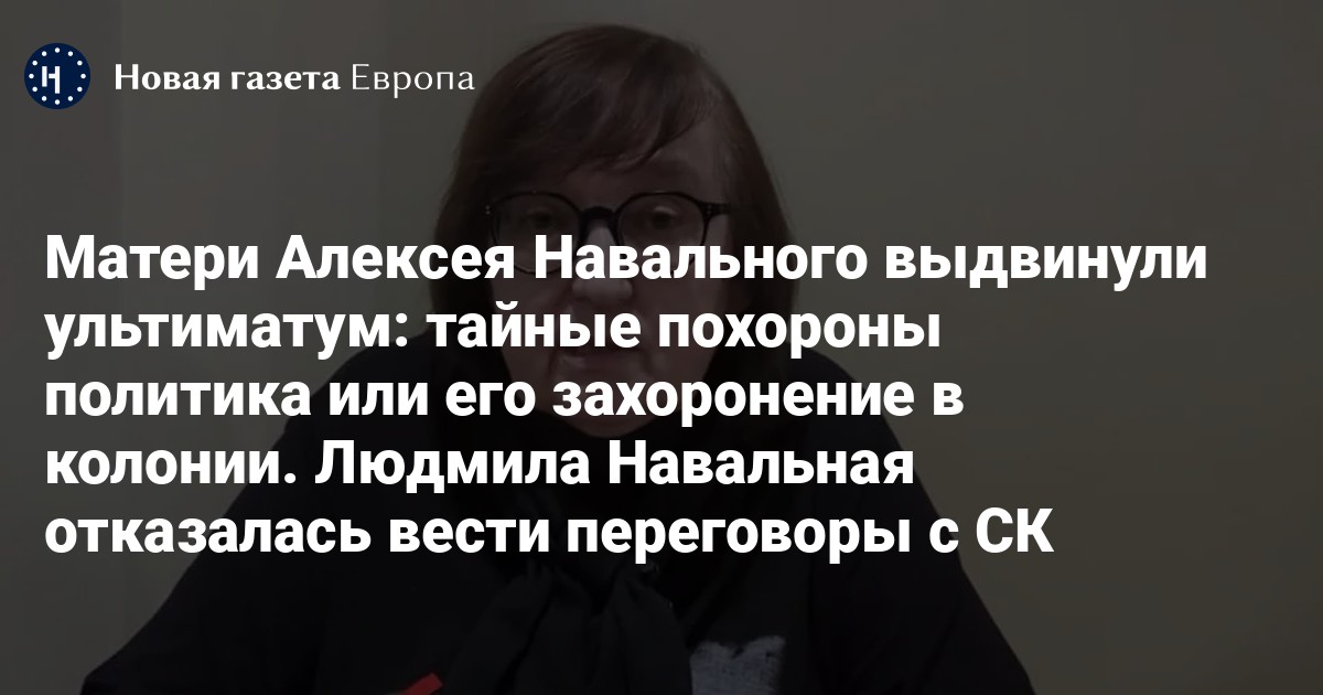 Следственный комитет поставил ультиматум матери Алексея Навального: или она в течение 3 часов соглашается на тайные похороны без публичного прощания, или Алексея захоронят в колонии. Об этом сообщила пресс-секретарь Навального Кира Ярмыш.