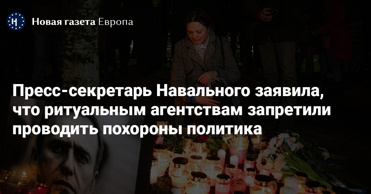 Ритуальным агентствам запретили организовывать похороны Алексея Навального. Как утверждает пресс-секретарь политика Кира Ярмыш, об этом ей заявили в одном из агентств.