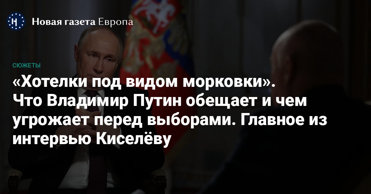 Владимир Путин дал большое интервью телеведущему Дмитрию Киселёву накануне президентских выборов. За полтора часа они обсудили состояние российской армии на войне в Украине, переговоры, вероятность применения ядерного оружия и то, как Россия приспосабливается к западным санкциям. Президент также пообещал, что на границе со вступившей в НАТО Финляндией появятся российские войска и системы поражения. При этом Путин постарался успокоить россиян перед голосованием, заявив, что деньги на внушительные социальные расходы, о которых он рассказывал Федеральному собранию, в бюджете найдутся.