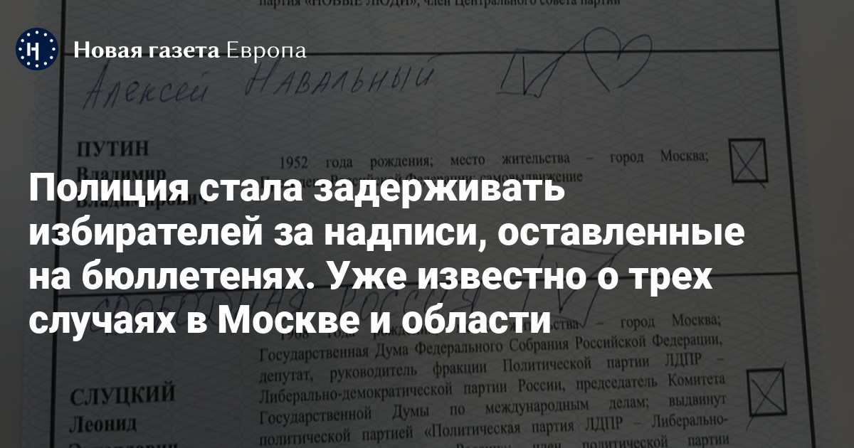 Полиция задержала минимум трех человек на избирательных участках, которые оставили надписи на бюллетенях. Об этом сообщают SOTA и «ОВД-Инфо».