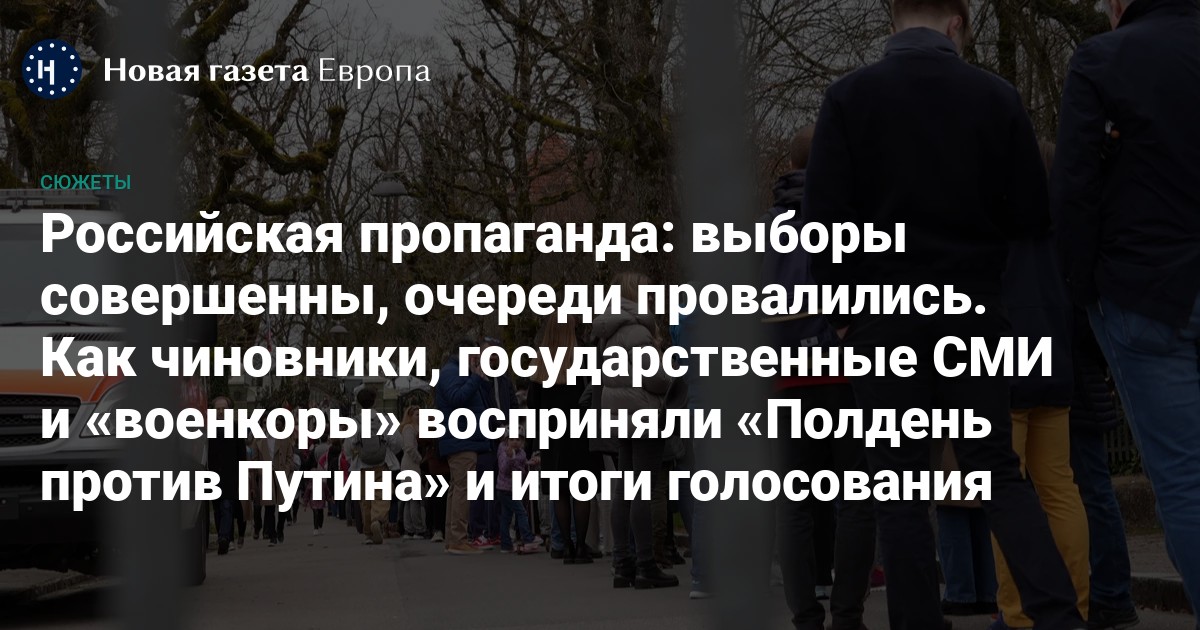 В России чиновники, пропагандисты и военкоры единодушно принялись хвалить электоральную процедуру. А фото очередей на избирательные участки в полдень 17 марта они трактовали не как протестную активность, а как проявление гражданской сознательности и политического волеизъявления, в том числе в соцсетях диппредставительств РФ.