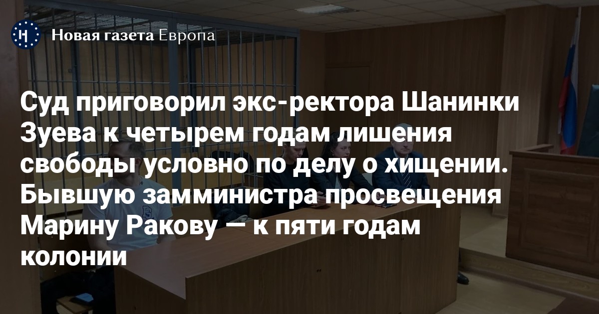 Никулинский районный суд Москвы приговорил бывшего ректора Шанинки Сергея Зуева к четырем годам лишения свободы условно, а бывшую замминистра просвещения Марину Ракову — к пяти годам заключения по делу о мошенничестве. Об этом сообщает ТАСС.