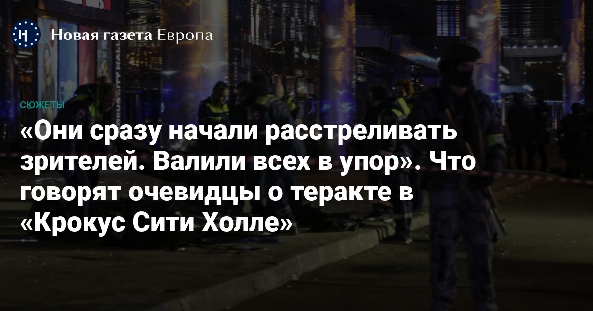 Первые сообщения о теракте в «Крокус Сити Холле» появились в девятом часу. Как сообщила собеседница «Новой-Европа», стрельба началась прямо перед началом концерта, между вторым и третьим звонком. По ее словам, из концертного зала они услышали звуки автоматной очереди в фойе, после чего охранники сообразили выпустить людей из зала через сцену. В момент стрельбы люди сдавали пальто. Очевидцы также предполагают, что стрелять начали еще на улице. Кто-то из присутствовавших в зале попытался спрятаться между рядами.