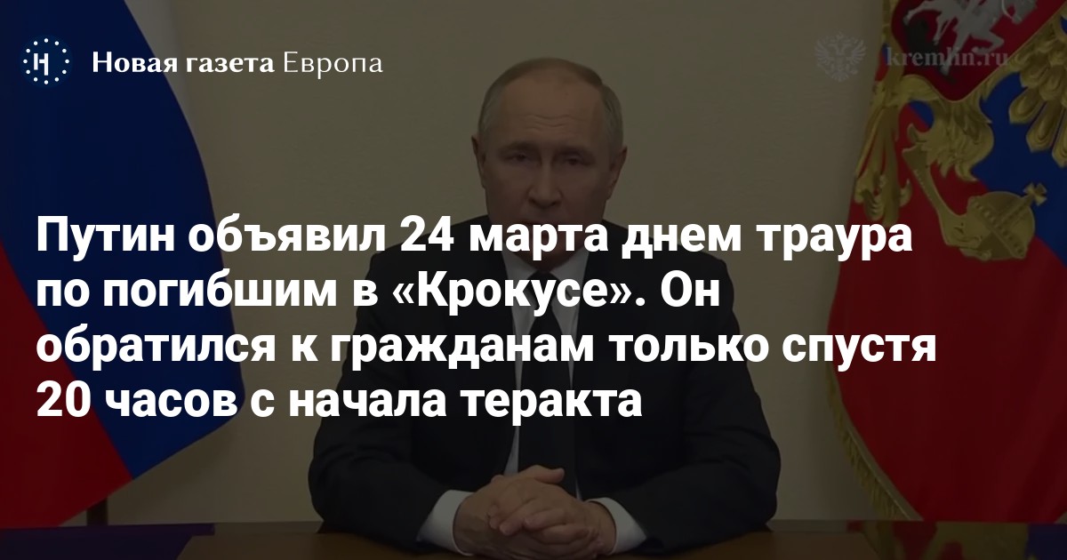 Президент России Владимир Путин во время обращения к гражданам в связи с терактом в «Крокус Сити Холле» объявил 24 марта днем общенационального траура. Расшифровка его речи опубликована на сайте Кремля.