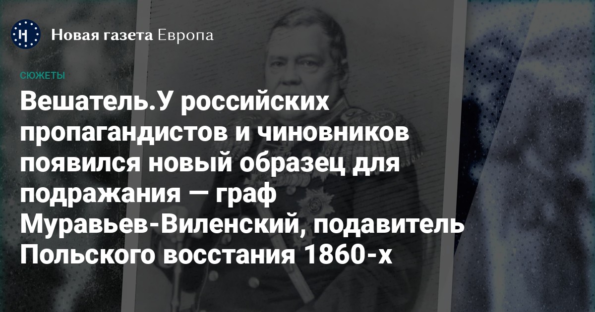 «Был в нашей истории такой граф Муравьев, “вешатель” всем известный. Он был родственник повешенного декабриста и, когда ему на это пеняли, говорил: “Я не из тех Муравьевых, которых вешали. Я из тех, которые вешают”», — заявила на прошлой неделе главред телеканала RT Маргарита Симоньян. В эфире «Воскресного вечера с Владимиром Соловьевым» она напомнила аудитории, что, будучи виленским губернатором, граф Михаил Муравьев повесил 128 участников Польского восстания, и добавила, что «новым российским территориям» срочно нужны такие же вешатели.