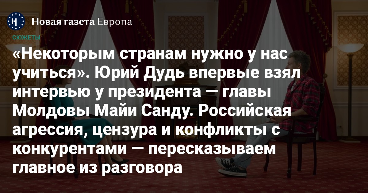 Журналист Юрий Дудь впервые взял интервью у действующего президента — главы Молдовы Майи Санду. Двухчасовой разговор состоялся в Кишинёве. Дудь также стал первым российским журналистом, с которым Санду пообщалась после начала полномасштабной войны в Украине.