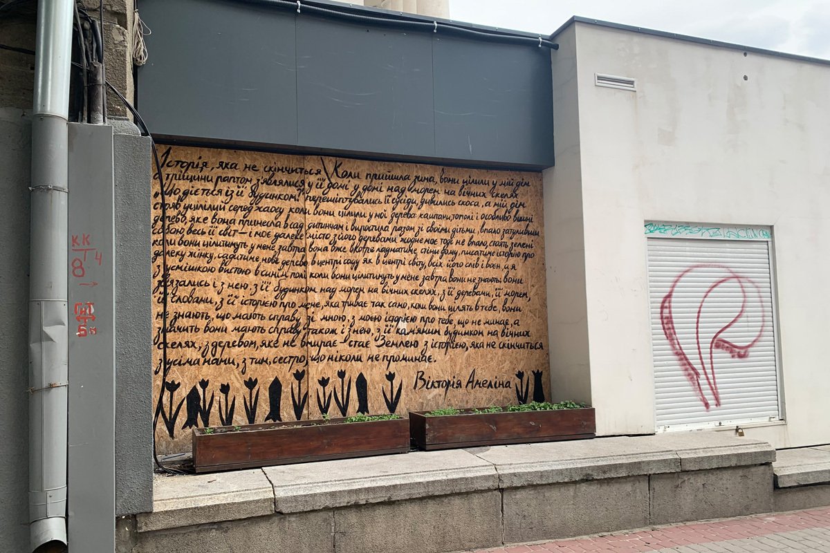 Продолжали работать магазины, кофейни, аптеки, банки, общественный транспорт. По центральной улице Сумской, где ослепших, закрытых фанерными щитами окон в зданиях эпохи конструктивизма больше, чем целых, фланировали девочки-выпускницы. Часть щитов превратилась в самостоятельные арт-объекты. Украшены то петриковской росписью (украинская декоративно-орнаментальная народная живопись. — Прим. ред.), то портретами и цитатами Григория Сковороды, то фрагментами из произведений Владимира Вакуленко или Виктории Амелиной, современных харьковских литераторов, погибших от рук российских военных.