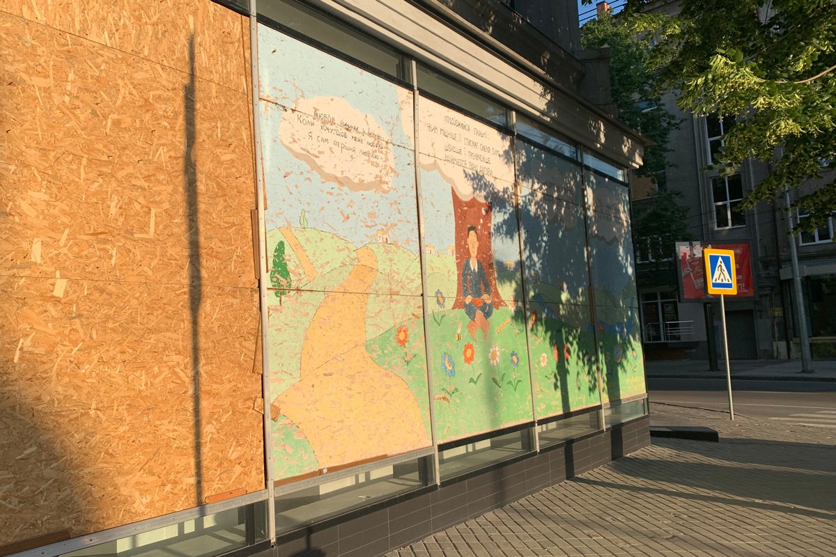 Щиты из фанеры, прикрывающие выбитые обстрелами окна, превращенные в арт-объекты в центре Харькова. Фото: Ольга Мусафирова / «Новая газета Европа»