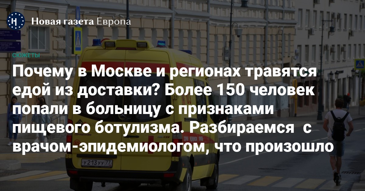 К 17 июня в Москве 121 человек обратился за медицинской помощью с симптомами ботулизма, 30 из них сейчас находятся в реанимации. Еще 14 случаев ботулизма были зарегистрированы в Казани, столько же — в Нижнем Новгороде. В Москве причиной отравлений предположительно стал некачественный салат, который пострадавшие заказали через сервис доставки продуктов «Кухня на районе». В составе салата была консервированная фасоль.