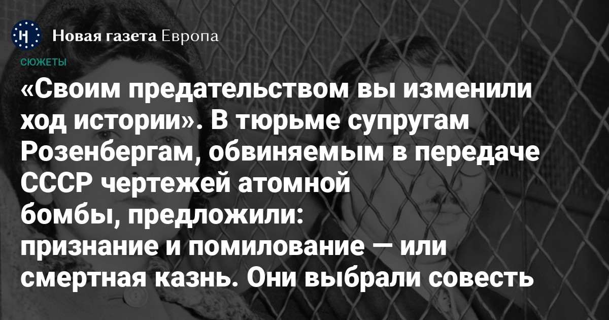 19 июня 1953 года в тюрьме Синг-Синг с разницей в один час были казнены Юлиус (Джулиус) и Этель Розенберги. В апреле 1951 года их признали виновными в шпионаже в пользу Советского Союза, возложив на супругов ответственность за передачу русским атомных секретов США. Об отмене смертного приговора супругам Розенбергам просили многие видные ученые, писатели, художники, президент Франции Шарль де Голль и папа римский Пий XII, но президент США Дуайт Эйзенхауэр был непреклонен. Перед казнью супругов поставили перед выбором: признание своей вины и помилование — или смерть.