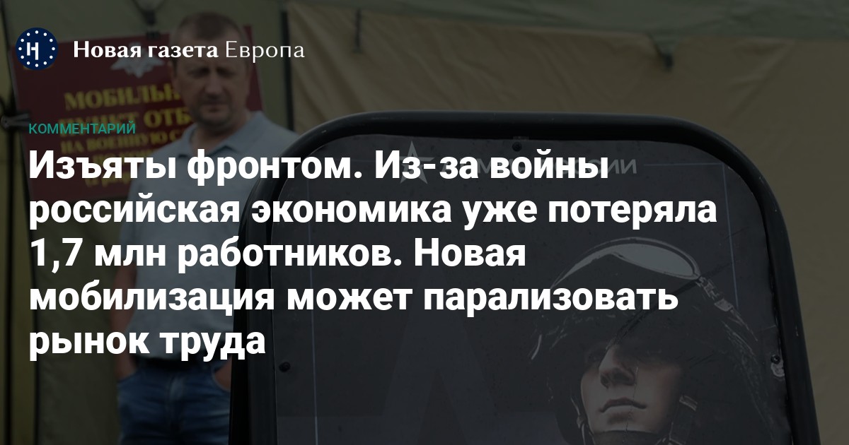 По подсчетам «Новой-Европа», из-за войны российская экономика уже могла потерять от 1,5 млн до 1,7 млн человек, или около 2,2% от численности рабочей силы в России (по данным Росстата, это 76 млн человек). Эти цифры складываются главным образом из отправки на фронт мобилизованных и контрактников, а также из вызванного войной бегства людей за границу и боевых потерь.