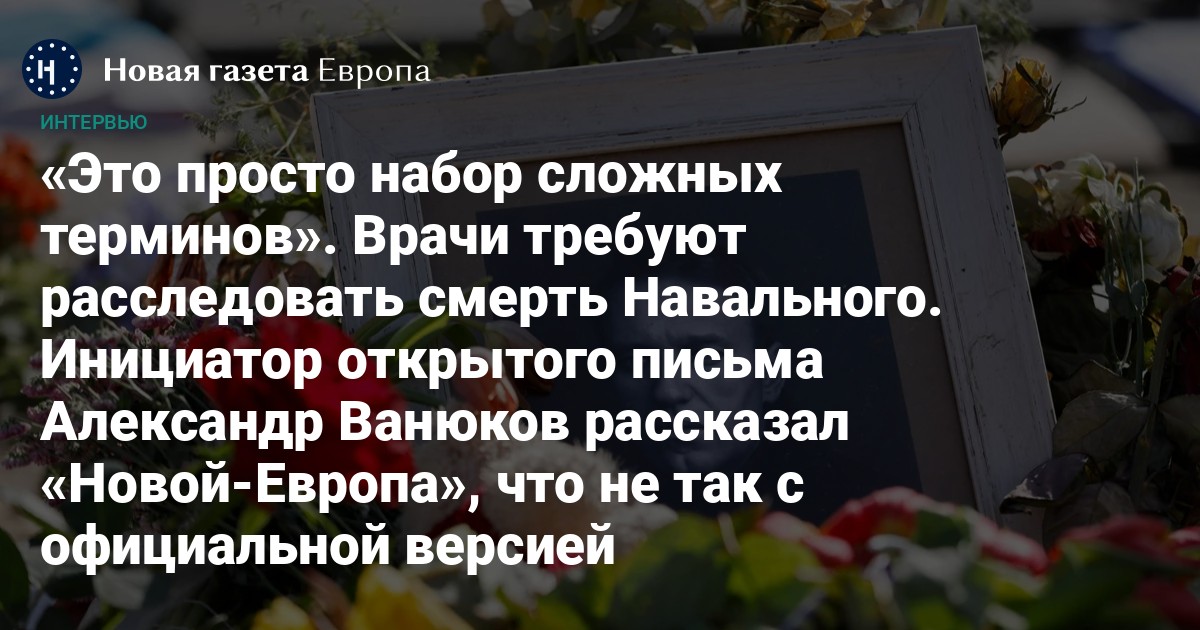 Почти двести медиков самых разных специальностей подписали письмо, адресованное Владимиру Путину, с требованием провести независимое и открытое расследование гибели Алексея Навального. Подписаны считают, что названная причина смерти — фибрилляция желудочков на фоне гипертонического криза — выглядит сомнительной. «Считаем выданное постановление сфабрикованным и преследующим своей целью сокрытие истинных причин смерти Алексея Навального», — говорится в письме. Мы поговорили с инициатором этой кампании, сосудистым хирургом Александром Ванюковым.