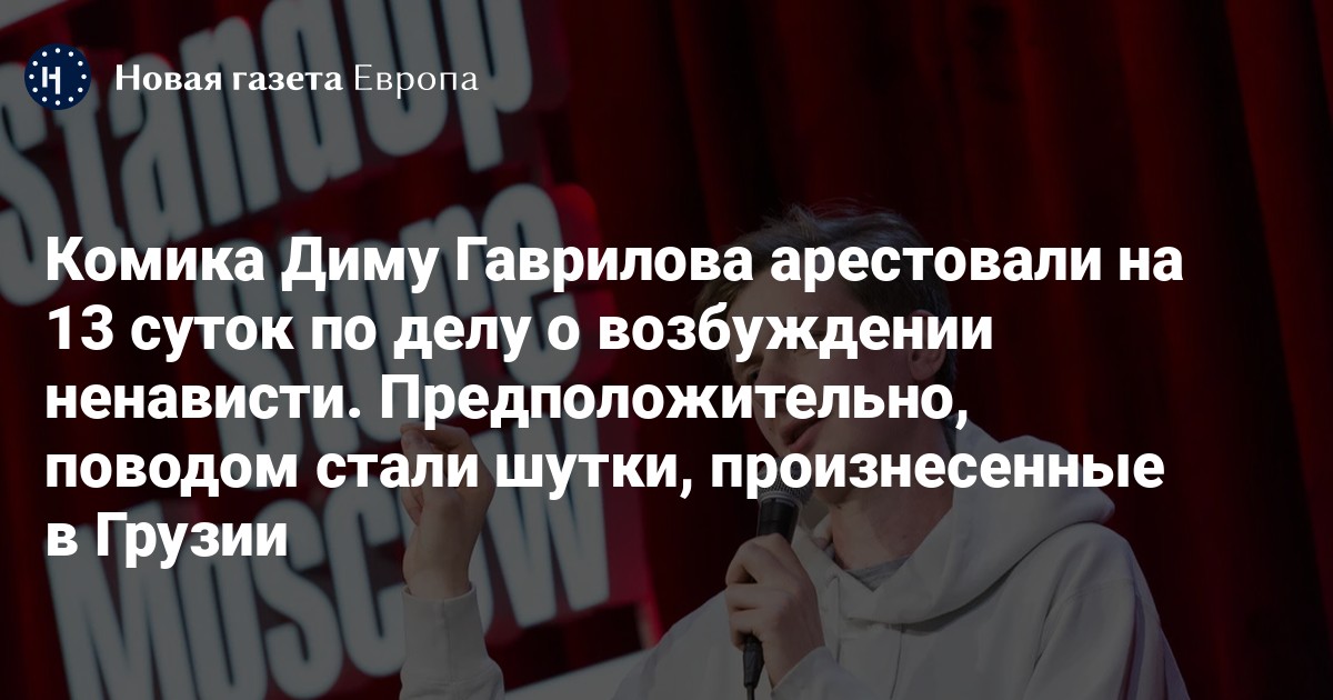 Нижегородский районный суд Нижнего Новгорода арестовал на 13 суток комика Диму Гаврилова по обвинению в возбуждении ненависти или вражды (ст. 20.3.1 КоАП). Об этом сообщают связанный с силовиками канал «Оперативные сводки», а также «Осторожно, новости».