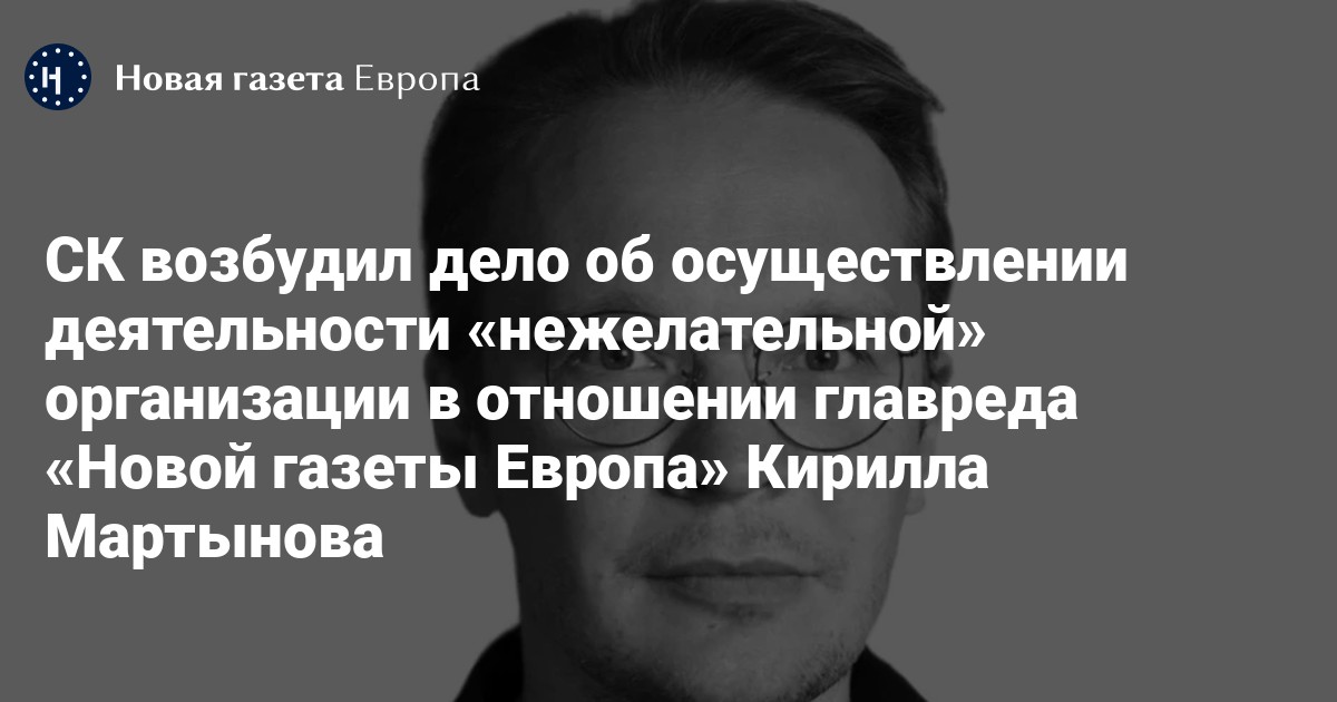 Следственный комитет возбудил дело по статье об организации деятельности «нежелательной» организации (ст. 284.1 УК) в отношении главреда «Новой газеты Европа» Кирилла Мартынова. Об этом пишут ТАСС и РИА Новости со ссылкой на источники.