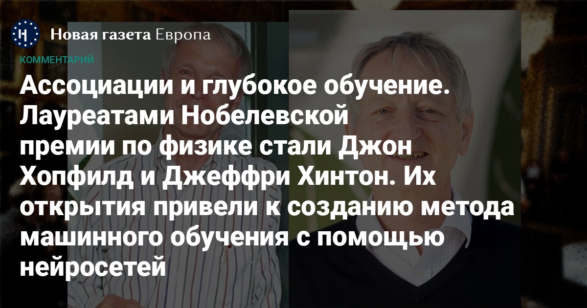 Нобелевский комитет 8 октября вручил премию по физике. Ее лауреатами стали Джон Дж. Хопфилд из Принстонского университета в США и Джеффри Э. Хинтон из Университета Торонто в Канаде. Ученые удостоились награды за вклад в «основополагающие открытия и изобретения, обеспечивающие машинное обучение с помощью искусственных нейронных сетей». Оба лауреата занимались статистической физикой, и их многолетняя работа привела к появлению нейросетей. «Хотя компьютеры не могут думать, теперь они могут имитировать такие функции, как память и обучение. Лауреаты этого года по физике помогли сделать подобное возможным», — говорится в заявлении Нобелевского комитета.