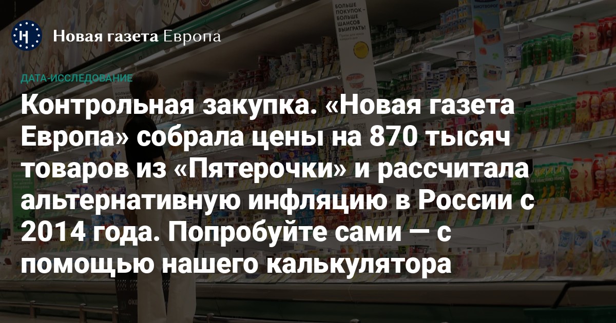 «Новая газета Европа» создала калькулятор, при помощи которого можно рассчитать свою персональную продовольственную инфляцию за последние пять лет (за этот период нам доступно больше данных) и сравнить ее с официальной инфляцией по Росстату.