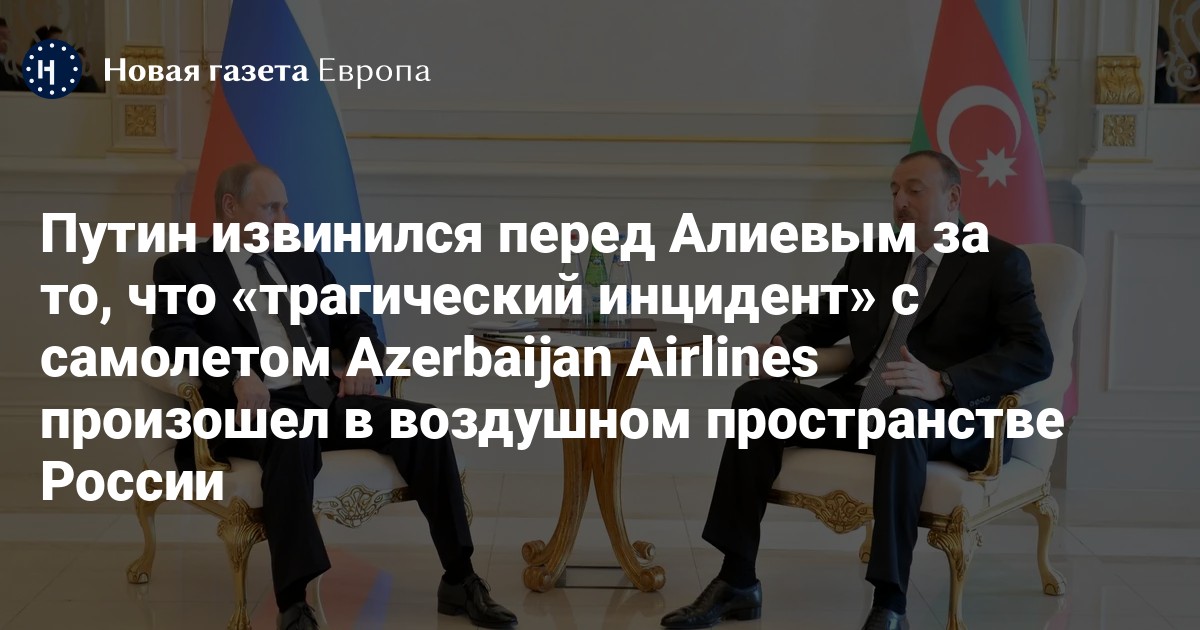Владимир Путин во время телефонного разговора извинился перед президентом Азербайджана Ильхамом Алиевым за то, что «трагический инцидент» с самолетом Azerbaijan Airlines произошел в воздушном пространстве России. Об этом сообщила пресс-служба Кремля.