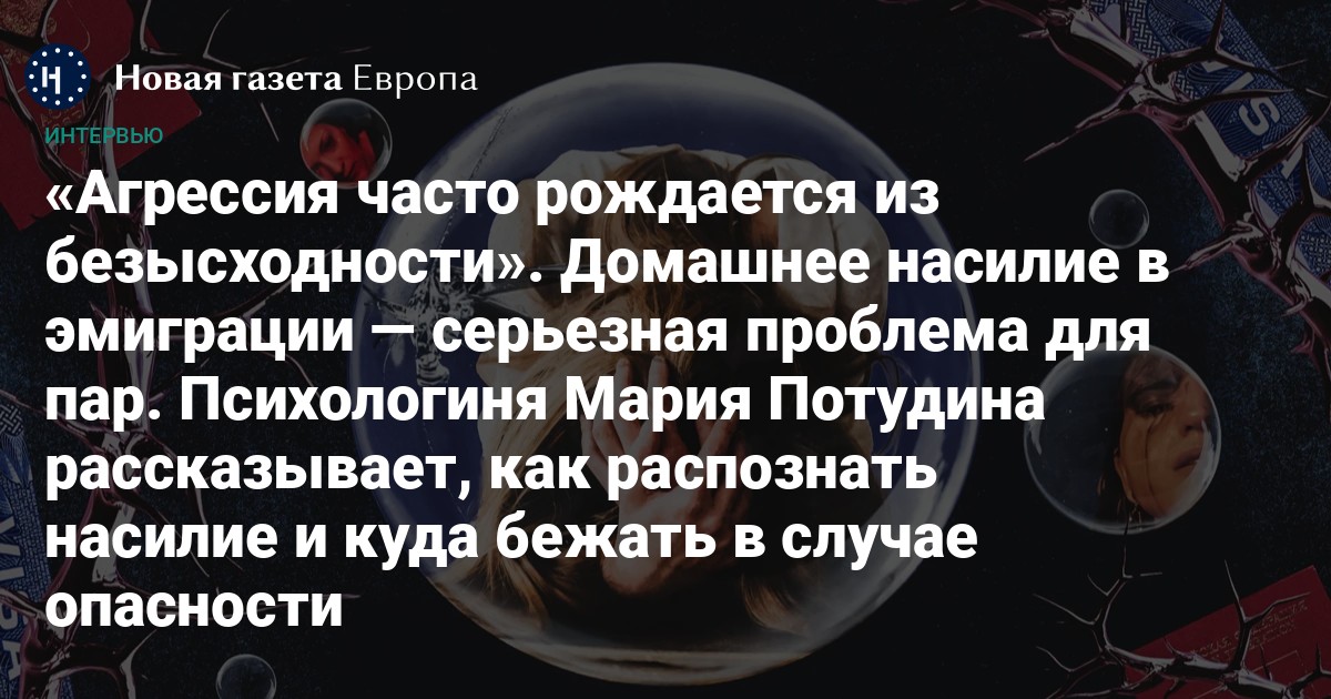 Тема домашнего насилия — одна из самых замалчиваемых в эмигрантской среде. В международных отчетах сообщают лишь о насилии в парах, в которых есть один иностранец. Случаи насилия в парах двух эмигрантов в статистику не входят. С началом войны России в Украине за рубежом появились русскоязычные организации и филиалы центров помощи жертвам домашнего и сексуализированного насилия. В них часто обращаются эмигрантки из России, Украины и Беларуси. «Новая-Европа» поговорила с психологиней Марией Потудиной, которая рассказала, с чем сталкиваются пары в эмиграции и как проводить профилактику домашнего насилия.