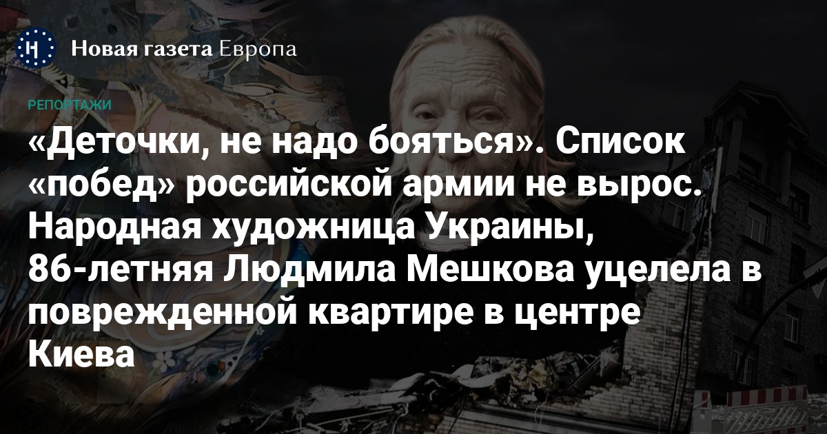 Переживает о близком будущем, похоже, только Михаил: скромная пенсия «шефини» уходит на дорогостоящий сердечный препарат. Чем платить? Он теребит чиновников. Заставляет Людмилу Ивановну поесть. Выслушивает не хуже биографа. Пересылает мне скан-копии «корочек» как бы в подтверждение заслуг Мешковой перед страной: Людмила Ивановна — член Национального союза художников Украины, член Национального союза кинематографистов Украины, награждена орденом княгини Ольги второй степени, медалью «За творческие достижения». Водит в свободное от службы время под ручку гулять, свежий воздух — тоже лекарство: «Нас все вороны на Липках узнают, Людмила Ивановна прикормила!» Ни тени снисходительной, покровительственной или корыстной доброты сорокалетнего к «уходящей натуре». И это произошло не после российского удара с воздуха. Так длится два с половиной года.