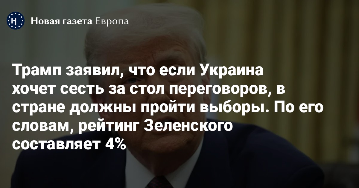 «Сейчас имеем ситуацию в Украине, когда уже давно не было выборов. Там военное положение введено. И лидер украинский теперь, как бы мне не было грустно это констатировать, его поддержка составляет 4%», — сказал Трамп.