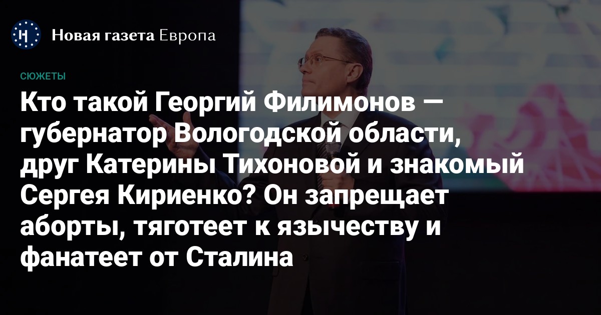 Самой приоритетной своей задачей губернатор Вологодской области называет «возрождение русского Севера». Георгий Филимонов неоднократно выступал за полный запрет на аборты в регионе. Ну, как при Сталине, когда женщины умирали во время подпольных абортов. Впрочем, этот сценарий глава региона не рассматривает.