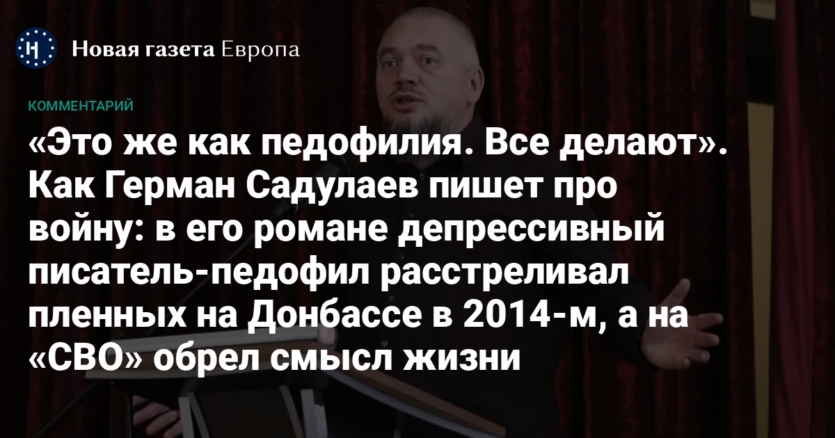 Пять страниц отведено педофильским эротическим сценам: главный герой, будучи маститым литератором, которого, правда, никто не читает, покровительствует 15-летней начинающей поэтессе, которая соблазняет его и явно испытывает удовольствие от того, что своей молодостью возбуждает престарелых мужчин (с. 29–34). Уже позднее Татаров/Садулаев возвращается к теме, вспоминая, как, будучи «донбасским добровольцем» в 2014-м, он расстрелял двух пленных: «Это же как педофилия. Все делают. Но не стоит трепаться» (с. 55).