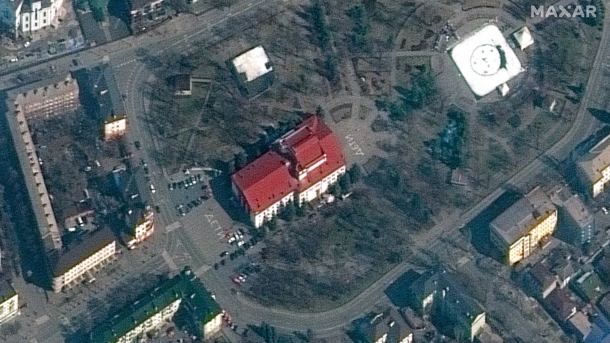 Спутниковый снимок разрушенного драмтеатра в Мариуполе, 29 марта 2022 года. Фото: Maxar Technologies / AFP / Scanpix / LETA