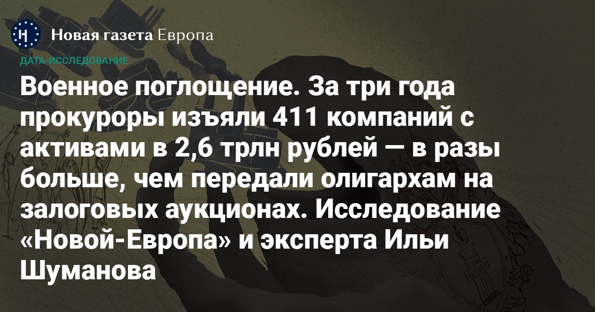 Изъятие бизнеса в пользу государства стало одним из главных трендов в российской экономике после начала полномасштабного вторжения в Украину. «Новая-Европа» совместно с антикоррупционным экспертом Ильей Шумановым изучила 100 исков о национализации, поданных прокурорами с начала 2022 года. Мы выяснили, что за это время государство изъяло активов почти на 2,56 триллиона рублей — это более 2% ВВП России за 2024 год.