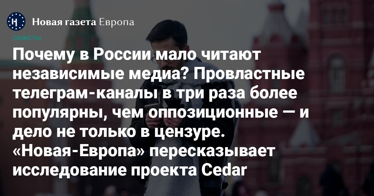 Проект Cedar провел масштабное исследование медиапотребления на примере телеграма — главного источника политической информации в России. С помощью опросов и анализа контента 43 телеграм-каналов проект изучил, как отличается тональность и какие темы освещают «оппозиционные», «провластные» и «нейтральные» медиа и как это связано с их популярностью. «Новая-Европа» пересказывает главные выводы и рекомендации о том, как медиа могли бы более эффективно доносить информацию до людей в России.