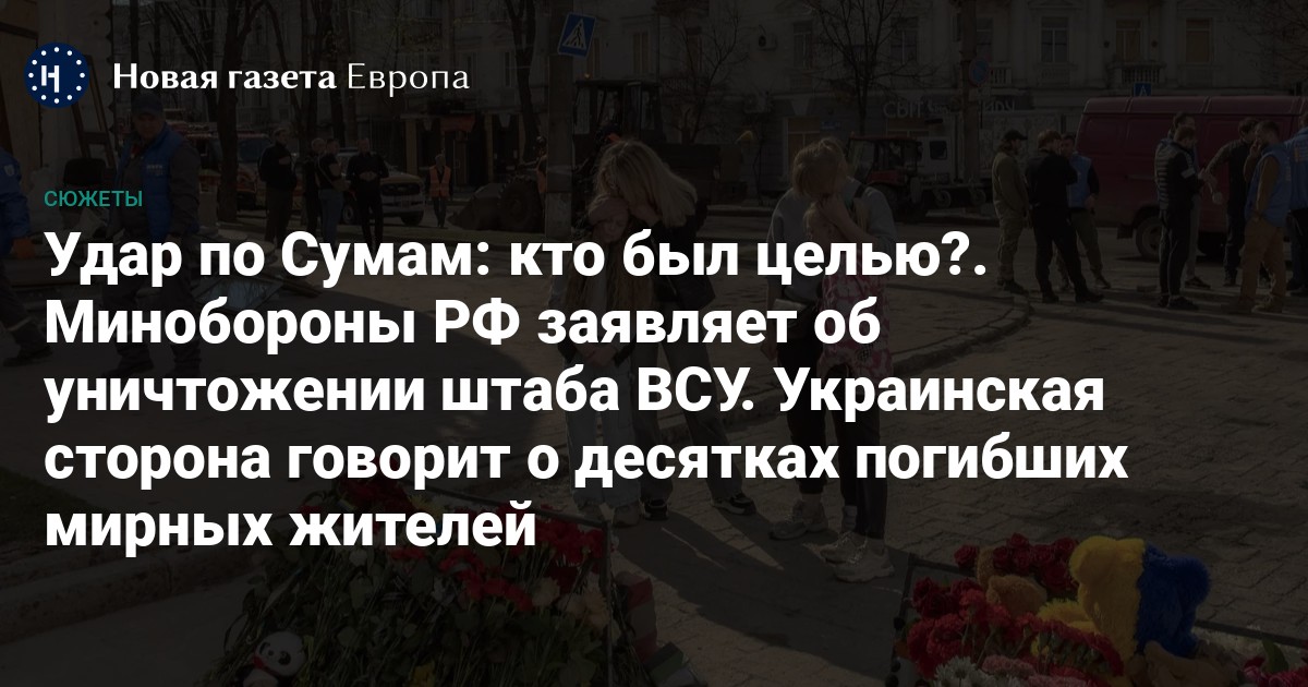 Минобороны РФ подтвердило, что российские военные нанесли удар двумя ракетами «Искандер-М» по городу Сумы 13 апреля. По версии ведомства, целью удара было место «проведения совещания командного состава оперативно-тактической группы “Северск”» ВСУ. При атаке якобы были убиты более 60 украинских военнослужащих, отчиталось Минобороны.