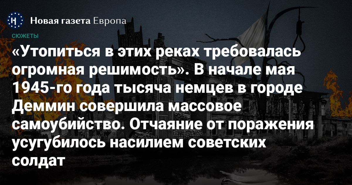 Восемьдесят лет назад, с 30 апреля и по 3 мая 1945 года, в маленьком немецком городе Деммин произошло массовое самоубийство жителей. Охваченные страхом перед наступающей и занявшей город Красной армией, местные, преимущественно женщины, приняли решение не только за себя, но и за своих детей. Всего погибло около тысячи человек. Рассказывает Григорий Аросев.