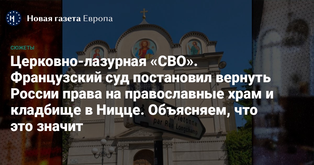 Приход старинного русского храма святых Николая и Александры в самом центре Ниццы, на улице Лонгшам, распространил сообщение о заседании апелляционного суда в городе Экс-ан-Прованс по делу о праве собственности на храм и опекаемое им местное русское кладбище Кокад. Заседание состоялось 24 апреля и отменило решение суда первой инстанции от 25 февраля 2021 года, которым право собственности закреплялось за Русской культовой (религиозной) православной ассоциацией (ACOR) — независимой от Москвы организацией русских эмигрантов, владеющей храмом и кладбищем с 1920-х. Апелляция пришла в движение спустя четыре года после ее подачи Российской Федерацией (через посольство в Париже) — и ACOR теперь обязана отдать ключи от храма. Ключами от кладбища Кокад на окраине Ниццы уже завладели представители кремлевского режима. Как показывает судьба другого православного храма Ниццы — крупнейшего на Лазурном берегу Франции Свято-Николаевского собора, — фактически объекты переходят под контроль Московского патриархата (РПЦ).