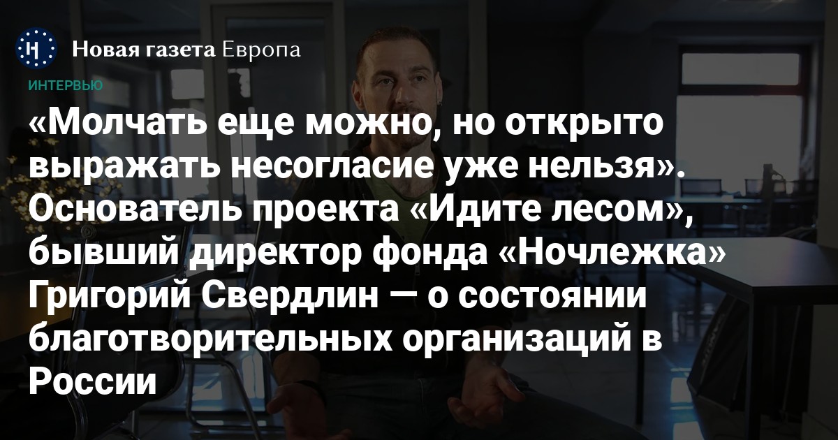 В условиях усиливающегося давления на НКО «Новая газета Европа» поговорила с Григорием Свердлиным, экспертом в области благотворительности, главой фонда «Ночлежка», проекта «Идите лесом» и куратором школы Bazaleti Uni «Сделай сам».