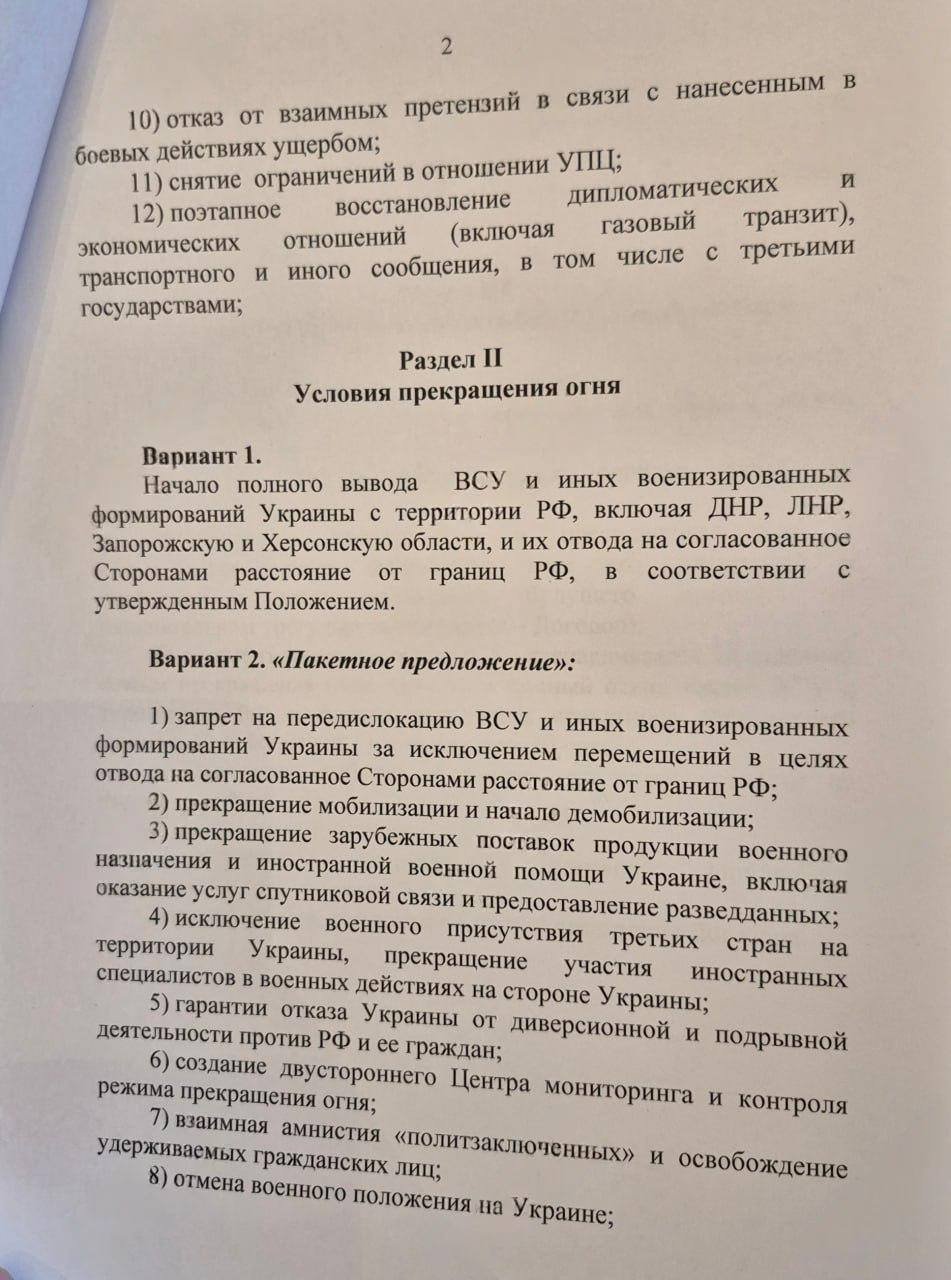 Российский меморандум также предполагает два варианта прекращения огня: первый предусматривает полный вывод ВСУ с территорий, которые аннексировала Россия, а второй содержит пункты о запрете «передислокации» ВСУ, прекращении мобилизации и поставок иностранной военной помощи, а также о начале демобилизации, исключении военного присутствия третьих стран.