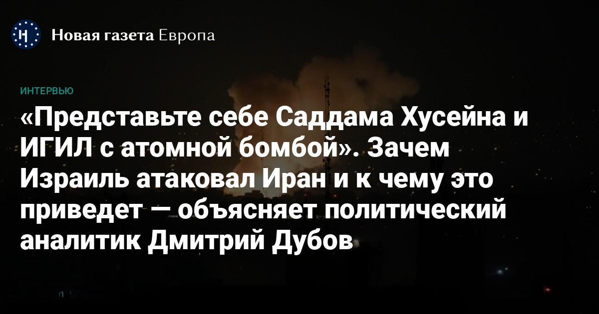 Рано утром 13 июня Израиль начал операцию «Народ как лев», ударив сразу по нескольким ядерным объектам в Иране и по ракетным базам. Операцию проводили совместно Моссад и ВВС страны. Убиты были командующий Корпусом стражей исламской революции (КСИР) Хоссейн Салами, начальник штаба вооруженных сил Ирана Мохаммад Хоссейн Багери, командующий ВВС Ирана Али Хаджизаде, командующий Центральным штабом Хатам аль-Анбия Голам-Али Рашид. Кроме того, убиты были ученые-физики, работавшие над ядерной программой Ирана; по данным на середину пятницы, их было шесть человек. Россия сразу осудила удары по ее союзнику, страны Европы или молчали, или осторожно «выражали озабоченность». Что будет дальше с ядерной программой Ирана, как Иран может ответить, как Израиль ответит на ответ, объясняет израильский политический аналитик, в прошлом главный редактор «9-го канала» Дмитрий Дубов.